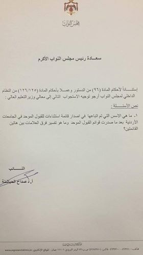 وجه النائب الدكتور صداح الحباشنة سؤال نيابي لوزير التعليم العالي والبحث العلمي حول الاسس التي تم ابتاعها في اصدار قائم استثناءات القبول الموحد في الجامعات الاردنية بعد ما صدرت قوائم القبول الموحد وما هو تفسير فرق العلامات بين هاتين القائمتين؟.