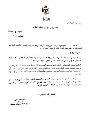 وبين العرموطي انه ومن قبيل الاطلاع ومعرفة كيفية الحصول على الجنسة واتفاقها مع الدستور والقوانين والتشريعات اردت الاطلاع على اسماء وجنسيات الاشخاص الذين حصلوا على الجنسيات الاردنية وما هي اصولهم هل هي يهودية او اجنبية وانه حق مشرع كفله الدستور له .