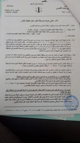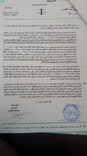اخبار البلد - تقدم النائب محمد الرياطي رسميا اليوم لدى محكمة العقبة بأنذار عدلي بحق سلطة العقبة الاقتصادية الخاصة ورئيسها "ناصر الشريدة" جراء طلبهم اغلاق مكتب النائب الرياطي ، حيث أكد الرياطي ان الاجراءات التي اتخذتها سلطة العقبة غير قانونية اطلاقا ومعتبرا ذلك محاولة من السلطة لثنيه عن الاستمرار في عمله لكشف قضايا الفساد المالي والاداري .