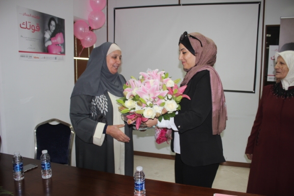 وفي ختام الفعالية كرمت نائب المدير العام للشؤون القانونية نسرين الحاج احد السيدات الناجيات"من سرطان الثدي السيدة ابتسام مصطفى " كمثال واقعي على اهمية الفحص المبكر لإنقاذ حياة الانسان ..
