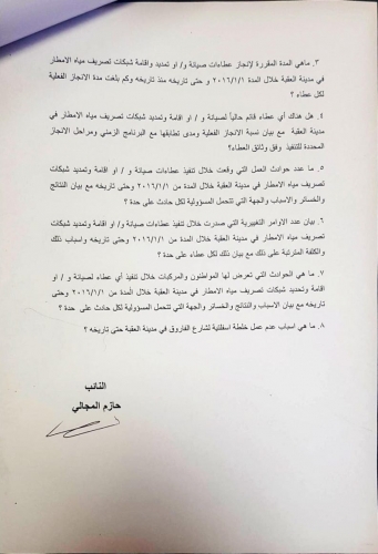 اخبار البلد - وجه النائب حازم المجالي سؤال نيابي الى رئيس الوزراء حول العطاءات التي طرحت لصيانة ولاقامة وتمديد شبكات تصريف مياه الامطار في مدينة العقبة.
