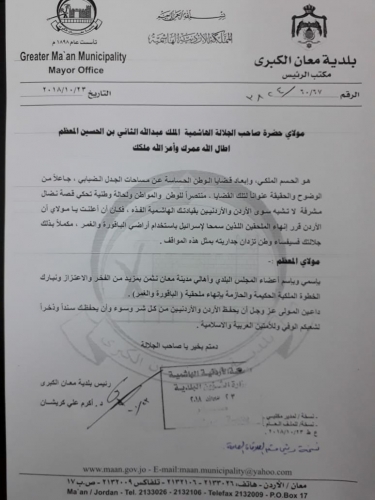 اخبار البلد - ثمن رئيس واعضاء مجلس بلدي محافظة معان (بلدية معان الكبرى) الخطوة الملكية الحكيمة والحازمة بانهاء ملحقي الباقورة والغمر .