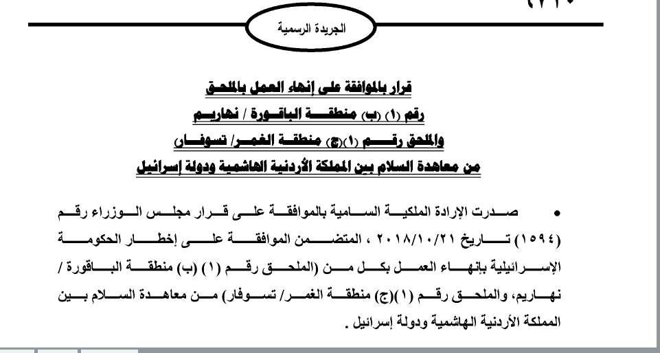 صدور الارادة ملكية بالموافقة لانهاء العمل بمنطقة الباقورة والغمر