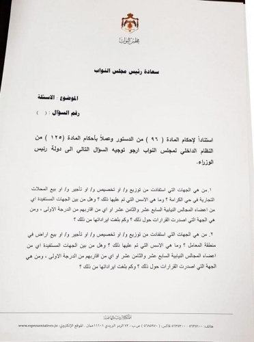 وتضمن سؤال النائب المجالي الاستفسار عن الجهات التي استفادت من توزيع او تخصيص او تاجير او بيع المحلات التجارية في حي الكرامة ؟ وما هي الاسس التي تم عليها ذلك ؟