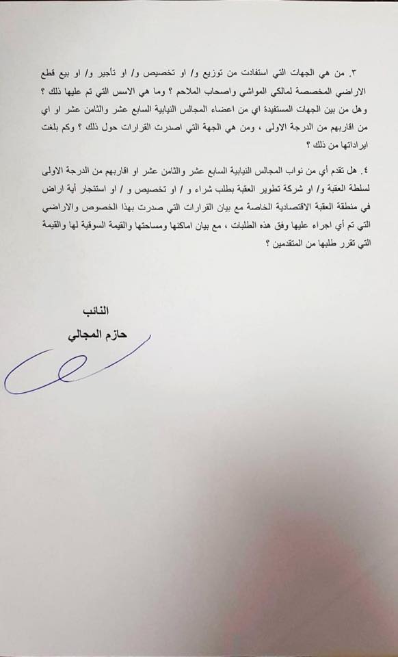 وجاء في سؤال المجالي الاستفسار حول الجهات التي استفادت من توزيع او تخصيص او تاجير او بيع قطع الاراضي المخصصة لمالكي المواشي واصحاب الملاحم ؟ وما هي الاسس التي تم عليها ذلك ؟ وهل من بين الجهات المستفيدة اي من اعضاء المجالس النيابية السابع عشر والثامن عشر او اي من اقاربهم من الدرجة الاولى ، ومن هي الجهة التي اصدرت القرارات حول ذلك ؟ وكم بلغت ايراداتها من ذلك ؟