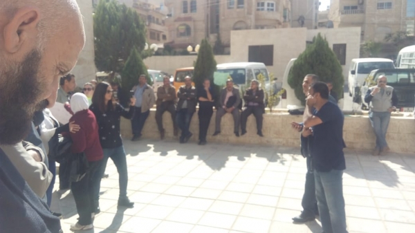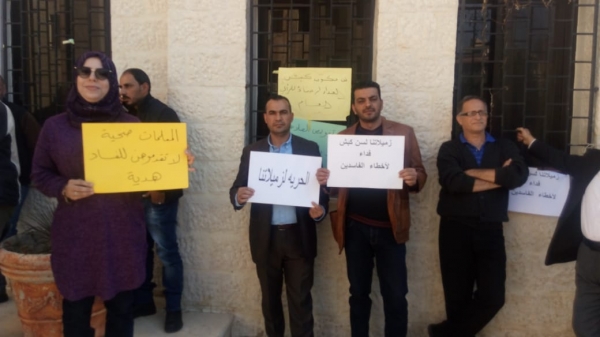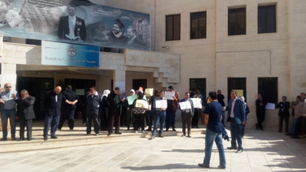 واصل موظفي مديرية تربية لواء الجامعة وقفتهم الاحتجاجية والتضامنية لليوم الثاني على التوالي للمطالبة بتدخل نقابة المعلمين وتحركها بشكل اقوى لتكفيل زملائهم الموقوفين في سجن الجويدة .