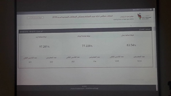 وبداية مع غرفة صناعة عمان والتي بلغت نسبت الاقتراع بها نحو (83.5 % ) بمجموع ( 1010 ) أصوات من أصل 1209 ناخبين يحق لهم التصويت في الانتخابات ، حيث شهدت اقبالا كبيرا منذ ساعات الصباح من قبل الناخبين لاختيار ممثليهم لمجلس إدارة الغرفة والقطاعات الصناعية... وحصدت كتلة "إنجاز" غاليبة المقاعد بالغرفة ، حيث فازت كتلة "انجاز" والتي يترأسها فتحي الجغبير بستة مقاعد، فيما فازت كتلة وطن والتي يترأسها نبيل إسماعيل بثلاثة مقاعد.