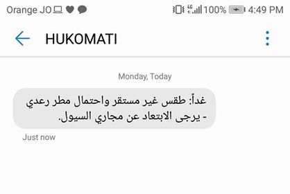 وأضاف الغرايبة أن الوزارة تقوم حاليا من خلال كوادرها بارسال الرسائل التحذيرية من أي طارئ جوي الى قاعدة البيانات الموجودة لديها والتي سوف تغطي جميع محافظات المملكة خلال رسائل تصلهم على هاتفهم الجوال وذلك التزاما من الحكومة بدورها الوطني تجاه اتخاذ جميع الاحتياطات التي من شأنها أن تحد من أي ضرر قد يلحق بالمواطن الأردني أو القاطنين فيه.