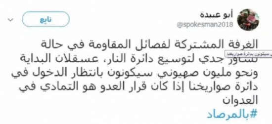 واضاف ابوعبيدة في تغريدة له عبر تويتر، ان بداية الصواريخ كانت في عسقلان، مضيفا ان نحو مليون اسرائيلي سيكونون بانتظار الدخول في دائرة صواريخ المقاومة إذا كان قرار الاحتلال تصعيد العدوان.