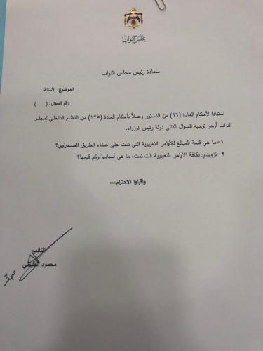 أخبار البلد - طالب النائب محمود الطيطي الحكومة بالكشف عن قيمة المبالغ للأوامر التغييرية التي تمت على عطاء الطريق الصحراوي.