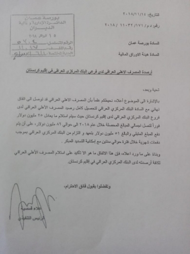 " بالإشارة الى الموضوع اعلاه نحيطكم علماً بان المصرف الأهلي العراقي قد توصل الى اتفاق نهائي مع السادة البنك المركزي العراقي لتحصيل كامل رصيد المصرف الأهلي العراقي لدى فروع البنك المركزي العراقي لدى اقليم كردستان حيث سيتم استلام ما يعادل 25 مليون دولار فوراً لتصل اجمالي المبالغ المحصلة خلال عام 2018 الى حوالي 86 مليون دولار على ان يتم دفع المبلغ المتبقي والبالغ 51 مليون دولار بتعهد والتزام من البنك المركزي العراقي بموجب دفعات شهرية خلال فترة حوالي سنتين مع امكانية التسديد المبكر
