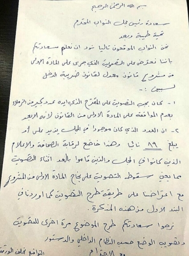 وتأتي هذه المذكرة في مسعى ومحاولة نيابية جديدة لرد قانون الضريبة.