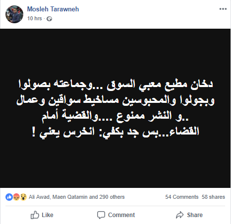 وقال :' دخان مطيع معبي السوق ...وجماعته بصولوا وبجولوا والمحبوسين مساخيط سواقين وعمال ..و النشر ممنوع ....والقضية أمام القضاء...بس جد بكفي: انخرس يعني !'