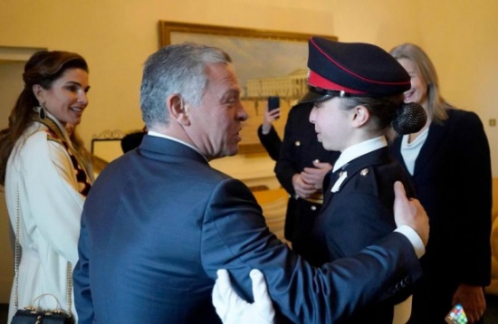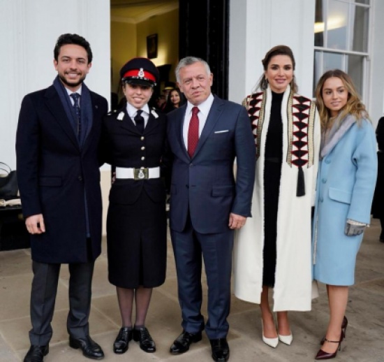 حضر جلالة الملك عبداالله الثاني ترافقه جلالة الملكة رانيا العبد الله وسمو الأمير الحسين بن عبدالله الثاني، ولي العهد، وسمو الأميرة إيمان بنت عبدالله الثاني، اليوم السبت، تخريج سمو الأميرة سلمى بنت عبدالله الثاني، من دورة عسكرية في الأكاديمية العسكرية الملكية ساندهيرست.