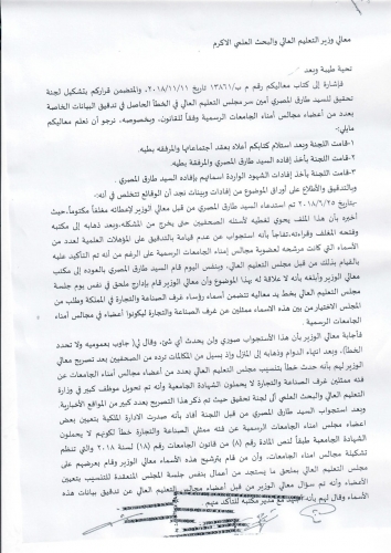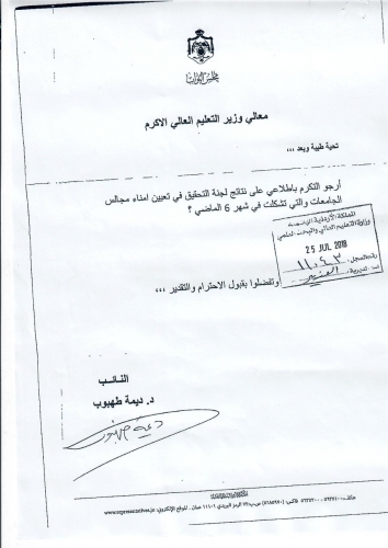 ردت وزارة التعليم العالي والبحث العلمي على مذكرة النائب الدكتورة ديمة طهبوب والتي طالبت من خلالها باطلاعها على نتائج لجنة التحقيق في تعيين امناء مجالس الجامعات والتي تشكلت في شهر (6) العام لماضي.