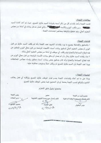 واظهرت توصيات اللجنة بان الموظف طارق المصري لم يرتكب اي فعل يخالف القانون والواقع ولذلك نسبت اللجنة بحفظ اوراق التحقيق فيما يخص الموظف المصري .