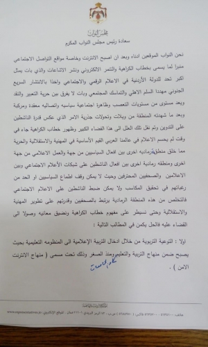 وقال النائب عطية ان المذكرة جاءت محاكاة لمقال صاحب الجلالة الهاشمية حول الكراهية والعنف واغتيال الشخصية والتي جاءت تحت عنوان (منصات التواصل ام التناحر الاجتماعي) مقتبساً من كلام جلالته " حين نتصفح منصات التواصل الاجتماعي نصطدم احياناً بكم هائل من العدوانية والتجريح والكراهية حتى تكاد تصبح هذه المنصات مكاناً للذم والقدح تعج بالتعليقات الجارحة والمعلومات المضللة، والتي تكاد تخلو من الحياء او لباقة التخاطب والكتابة دون مسؤولية اخلاقية او اجتماعية او الالتزام بالقوانين التي وجدت لردع ومحاسبة كل مسيء" انتهى الاقتباس .