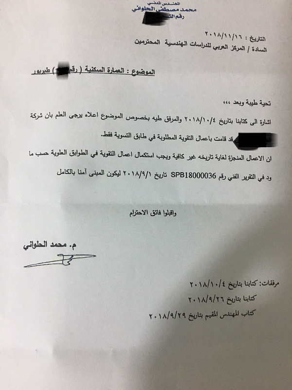 حيث اوضحت تقرير وصل " اخبار البلد" صادرة من قبل من قبل احد المهندسين التابعين للمركز العربي للدراسات الهندسية الذي اكد في تقريره عدم جاهزية العمارة السكنية حيث اكد خلال التقرير بأن الاعمال المنجزة لغاية الان غير كافية حيث يجب استكمال التقوية في الطوابق العلوية ليكون المبنى آمناً بالكامل ..
