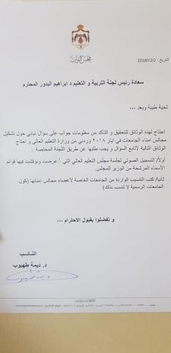 وقال النائب طهبوب في المذكرة التي ارسلتها الى زميلها البدور ، قالت احتاج لهذه الوثائق للتحقيق والتأكد من معلومات جواب على سؤال نيابي حول تشكيل مجالس امناء الجامعات في ايار 2018 وردني من وزارة التعليم العالي واحتاج الوثائق لاتابع السؤال.