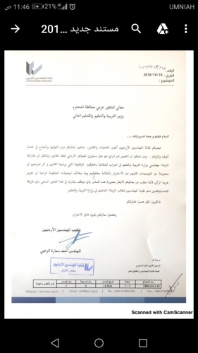 ومن الجدير بالذكر ان عدد المهندسين الموظفين في وزارة التربية والتعليم يبلغ حوالي (750) مهندس صناعي و (350) مهندس زراعي يتبعون لنقابة المهندسين والمهندسين الزراعيين.