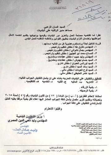 قرر وزير الشؤون البلدية وليد المصري تشكيل لجنة برئاسة مساعد مدير الرقابة على البلديات للتدقيق والتفتيش على بلديتي الزرقاء والرصيفة.