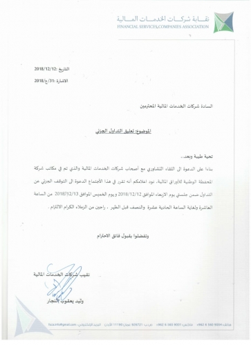 وجة نقيب شركات الخدمات الماليه وليد النجار كتاباً رسمياَ الى اعضاء الجمعية يحثهم من خلاله على ضرورة تنفيذ توصيات اللقاء التشاوري مع اصحاب شركات الخدمات الماليه والذي تضمن الدعوه الى التوقف الجزئي عن التداول ضمن جلستي يوم الاربعاء الموافق 12/12/2018 يوم الخميس الموافق 13/12/2018 من الساعه العاشره ولغايه الساعه الحاديه عشرة والنصف قبل الظهر