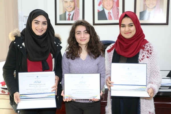 ومثل الجامعة في الحفل الذي شارك فيه طلبة خمس عشرة جامعة أردنية، الطالبتان في تخصص التصميم الجرافيكي يارا غاندي، وجنى صالح، والطالبة في تخصص هندسة العمارة رهام عطا علقم، وذلك من خلال لوحات فنية من عمل الطالبات، تعكس بنود حقوق الانسان.
