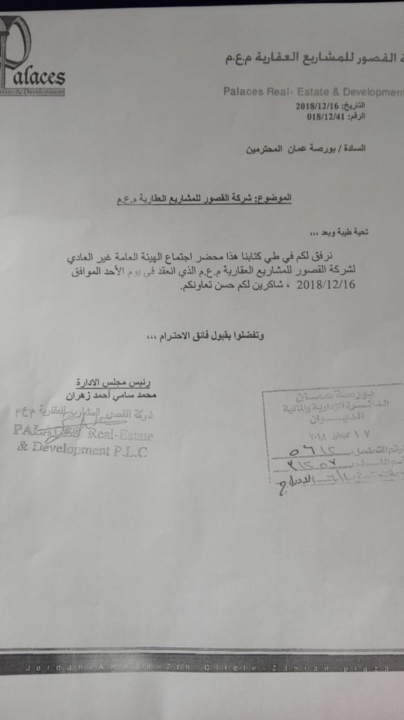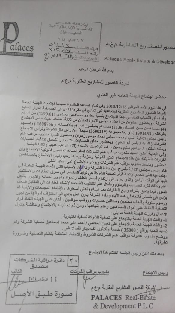 وافقت الهيئة العامة لشركة القصور للمشاريع العقارية في اجتماعها غير العادي الذي عقدته في مقرها في الصويفية وبحضور مساهمون يملكون 90 % من راس مال الشركة وبحضور عضوين من اعضاء مجلس الادارة المكون من 3 اعضاء في الجلسة التي ترأسها رئيس مجلس الادارة محمد سامي زهران وبحضور مندوب مراقب عام الشركات ومدقق الحسابات على تصفية الشركة تصفية اختيارية وتعيين المحامي احمد اسماعيل مصفيا لها ..