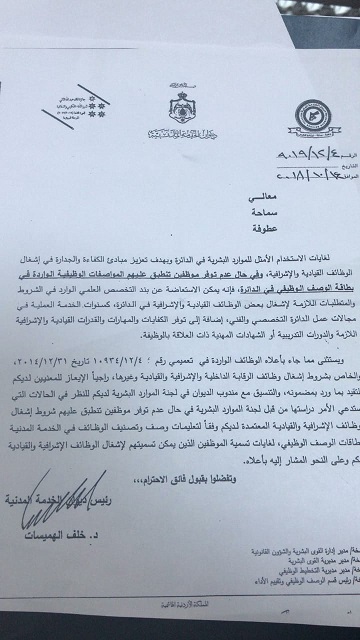 طالب كتاب صادر من قبل هيئة النزاهة ومكافحة الفساد الى المجلس الطبي الاردني بخصوص بطاقة الوصف الوظيفي لبعض موظفي المجلس الطبي الاردني بضرورة الالتزام بقوانين الخدمة المدنية والذي يشترط التخصص العلمي الوارد في الشروط والمتطلبات اللازمة لإشغال بعض الوظائف القيادية والاشرافية في اي دائرة ..