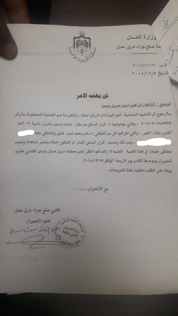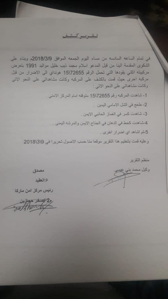 واضاف الذيب انه توجه الى مركز امن ماركا لتقديم شكوى والحصول على تقرير عن حادث التصادم ليقدمه الى المحكمة لمقاضاة صاحب المركبة ذات اللوحة السعودية.
