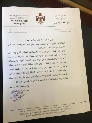 أخبار البلد - اخبار البلد - اكدت بلدية معاذ بن جبل في بيان اصدرته اليوم الاحد انها غير معنية وغير مشاركة في اي من الاحتجاجات والاعتصامات او اي حراك يدعى له من الجهات والمؤسسسات غير الرسمية.