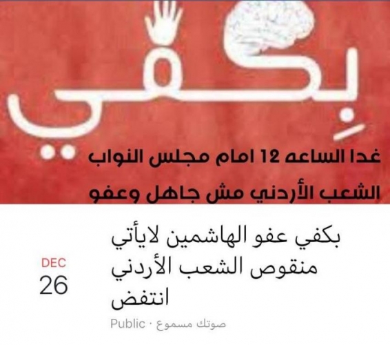 أخبار البلد - اخبار البلد - دعا رافضون للشكل النهائي الذي خرج به مشروع قانون العفو العام الذيي أفصحت عنه الحكومة الاثنين الى الاحتجاج الساعة الثانية عشر يوم الاربعاء امام مجلس النواب تحت شعار الشعب الاردني مش جاهل.