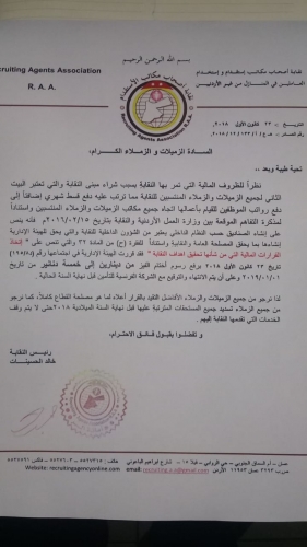 وتساءلوا هل اصبحت النقابة جهة سلطتها اعلى من سلطة وزارتي العمل والداخلية حتى تقوم بختم المعاملات قبل الوزارتين؟ وكيف يسمح وزير العمل للنقابة بفرض الختم قبل تسليم المعاملة لوزارة العمل في الوقت الذي يدفع كل صاحب مكتب عن كل معاملة استقدام رسوم تبلغ (625) دينار.
