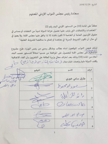 حيث اكد النائب الطارق خوري من خلال العريضة التي يتبناها على ان المعاهدات والاتفاقات التي يترتب عليها تحميل خزانة الدولة شيئا من النفقات او مساس حقوق الاردنيين العامة او الخاصة لا تكون نافذة الا اذا وافق عليها مجلس الامة ولا يجوز في اي حال ان تكن الشروط السرية في معاهدة او اتفاق ما مناقض للشروط العلنية .. ويجدر بان العريضة وقع عليها لغاية الان 31 نائب