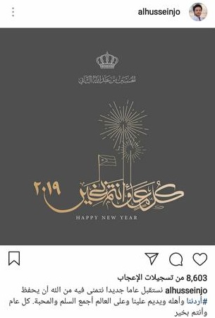 نشر ولي العهد سمو الأمير الحسين بن عبدالله الثاني عبر حسابه الرسمي على موقع التواصل الاجتماعي الانستغرام بمناسبة حلول العام الجديد وقال :"نستقبل عاما جديدا نتمنى فيه من الله أن يحفظ #أردننا وأهله ويديم علينا وعلى العالم أجمع السلم والمحبة. كل عام وأنتم بخير".