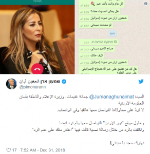 أخبار البلد - تجاهلت وزير الدولة لشؤون الإعلام والناطق باسم الحكومة جمانة غنيمات، الصحفي الإسرائيلي شمعون آران، بعدما راسلها عبر تطبيق "واتس آب".