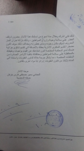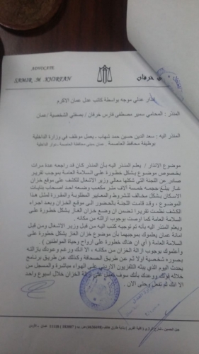 وأشار خرفان بالإنذار العدلي بأن المنذر إليه بأن المنذر كان قد راجعه عدة مرات بخصوص موضوع يشكل خطورة على السلامة العامة بموجب تقرير صادر عن اللجنة التي شكلها وزير الأشغال للكشف على موقع خزان غاز يبلغ حجمه خمسة آلاف متر مكعب وضع بشكل مخالف للشروط والمعايير المطلوبة.