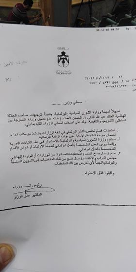 وعمم الدكتور عمر الرزاز على كافة الوزراء باستحداث اقسام تختص بالشأن البرلماني وترتبط بمكتب الوزير لضمان سرعة المتابعة والاستجابة على ادوات الرقابة البرلمانية.