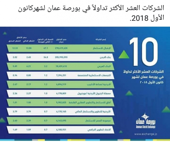 برزت خلال شهر كانون الاول لعام 2018 عدة شركات كانت الاكثر تداولاً في بورصة عمان.. حيث احتلت شركة الاقبال للاستثمار المركز الاول في نسبة تداولها وبلغت نسبتها بالنسبة الى التداول الكلي للبورصة 47.1% .... فيما احتل البنك الاردني المركز الثاني وبنسبة 34.8 وتلاه البنك العربي بالمركز الثالث ..
