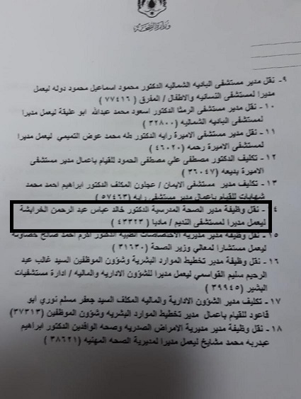وطالب الخرابشة في استقالته المقدمة باحالته الى التقاعد بتاريخ 1/2/2019 رافضاً الانتقال الى مستشفى النديم الحكومي في مادبا مديراً لها ..
