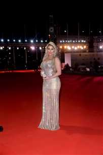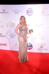 واختارت الفنانة زينة العلمي فستاناً شفافاً باللون الأبيض الداكن، مع خطوط ذهبية من تصميم مصمم الأزياء أحمد فايز.