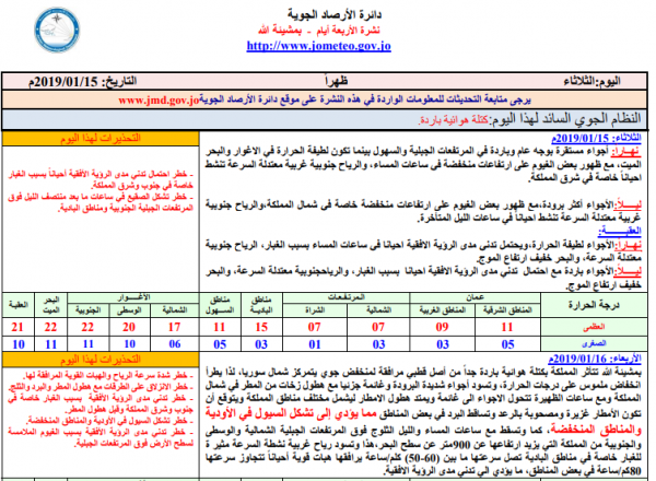 قال مدير التنبؤات الجوية في دائرة الارصاد الجوية المهندس رائد رافد آل خطاب انه من المتوقع ان تشهد المملكة تساقط للثلوج مع ساعات المساء والليل على المرتفعات الجبلية الشمالية والجنوبية والوسطى والتي يزيد ارتفاعها عن (900) متر فوق سطح البحر .