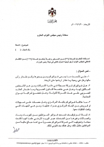 ووجه سؤالا حول توقيف تسديد الفواتير من خلال البريد الاردني، مشيرا الى ان الخدمة كانت مجانية، كما سأل عن علاقة الشركة بالبنك المركزي، وما اذا كانت حصلت على تسهيلات او قروض من البنك المركزي ؟