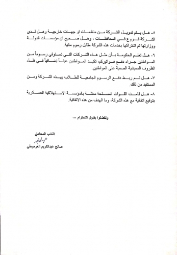 وتساءل العرموطي اذا تم ربط دفع الرسوم الجامعية للطلاب بهذه الشركة ومن المستفيد من هذا الربط؟ كما سأل اذا قامت القوات المسلحة ممثلة بالمؤسسة الاستهلاكية العسكرية بتوقيع اتفاقية مع هذه الشركة وما الهدف منها.
