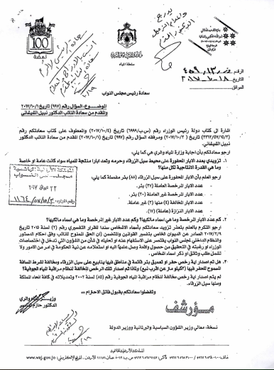 واكد الناصر في معرض رده على السؤال النيابي الموجه من النائب نبيل الشيشاني بتعذر تزويده باسماء الاشخاص المالكين للآبار المرخصة ، وذلك سنداً للقرار التفسيري رقم (2) لسنة 2015 تاريخ 9/2/2017 الصادر عن الديوان الخاص بتفسير القوانين والمتضمن ( ان الحق الممنوح للنائب وفق احكام الدستور والنظام الداخلي لمجلس النواب يقتصر على الاستفهام عنه او تحليله في شأن من الشؤون التي تدخل في اختصاصات الوزراء او رغبته في التحقيق من حصول واقعة وصل علمها اليه او استعلامه عن نية الحكومة في امر من الامور ولا تشمل طلب وثائق او ذكر اسماء اشخاص .