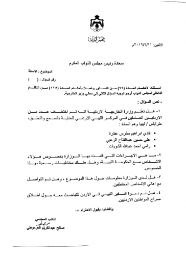 أخبار البلد - اخبار البلد - وجه النائب المحامي صالح العرموطي سؤال نيابي الى وزير الخارجية وشؤون المغتربين ايمن الصفدي حول الاجراءات التي قامت بها الوزارة في للافراج عن اردنيين تعرضوا للخطف في ليبيا.