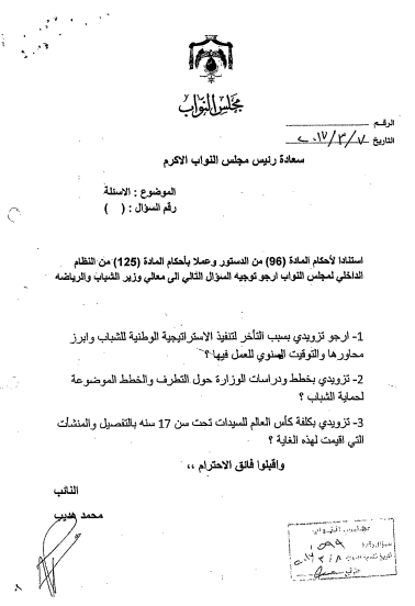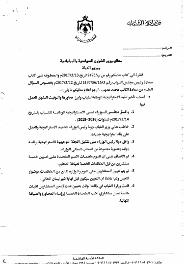 ورداً على سؤال النائب محمد ابو هديب حول اسباب تأخير تنفيذ الاستراتيجية الونية للشباب وابرز محاورها والتوقيت السنوي للعمل فيها ، قالت الحكومة ان مجلس الوزراء وافق على الاستراتيجية الوطنية بتاريخ 14/3/2017 للسنوات (2016- 2018).
