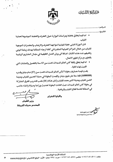وفيما يتعلق بخطط الوزارة حول التطرف والخطط الموضوعة لحماية الشباب بينت الوزارة انها تبنت خطة تنفيذية لمواجهة التطرف والارهاب والمخدرات الموجهة للشباب من خلال المراكز الشبابية المنتشرة في كافة ارجاء المملكة بهدف زيادة الوعي وتثقيفهم ضد هذه الافات اضافة الى ورش العمل التثقيفية في مجال المشاريع الريادية بالتعاون مع مركز تطوير الاعمال .