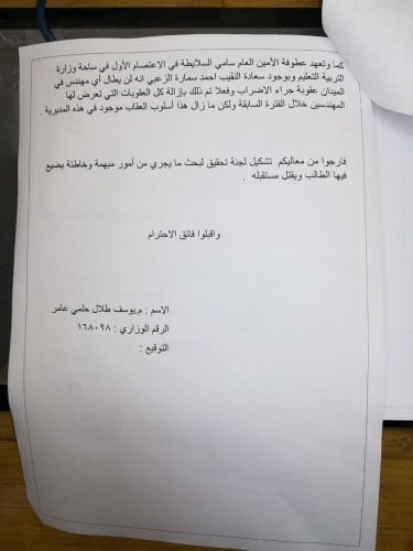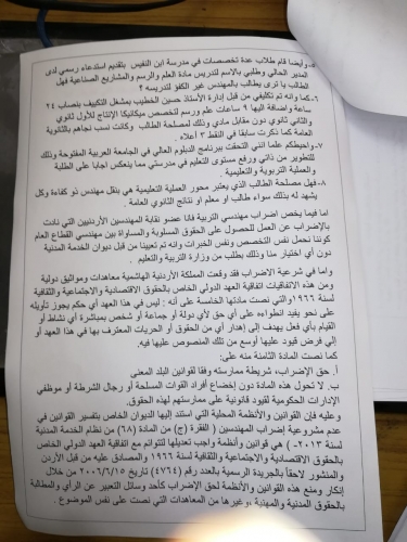 واكد ابو صافي انه يحق للمهندس العامل في وزارة التربية والتعليم الحصول على زيادة مقدارها (400) دينار كحد اعلى وانهم يريدون الحصول على الحد المتوسط منها والمقدر بـ(200) دينار ، كما اكد اصرار المهندسين على اقامة وقفتهم الاحتجاجية التي اعلنوا عنها سابقاً امام وزارة التربية والتعليم .