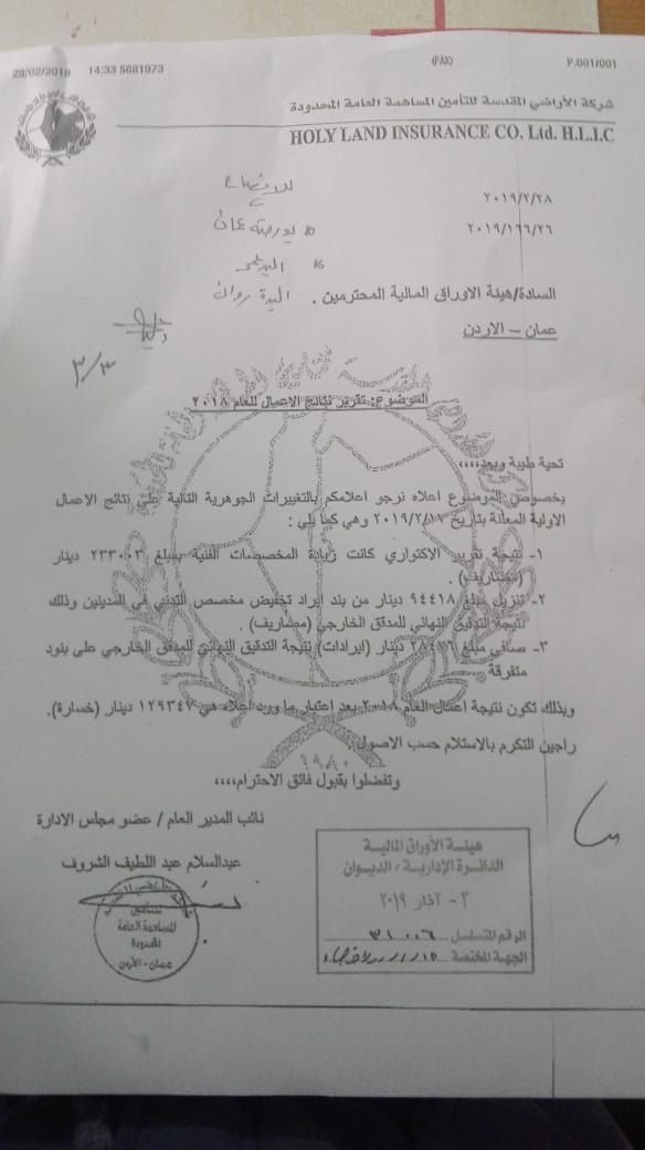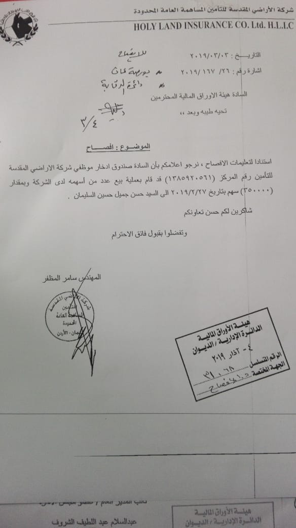 الاراضي المقدسة للتأمين.. تغييرات جوهرية وخسائر وعمليات بيع 350 الف سهم من صندوق الإدخار